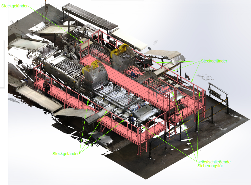 Als Planungsgrundlage diente eine hochpräzise Punktewolke, die es ermöglichte, die Bühne passgenau um die bestehende Anlage zu konstruieren. Die individuell angepasste Konstruktion umschließt die Sortieranlage nahezu vollständig und sorgt so dafür, dass Mitarbeitende in jeder Phase des Betriebs sicher arbeiten können.