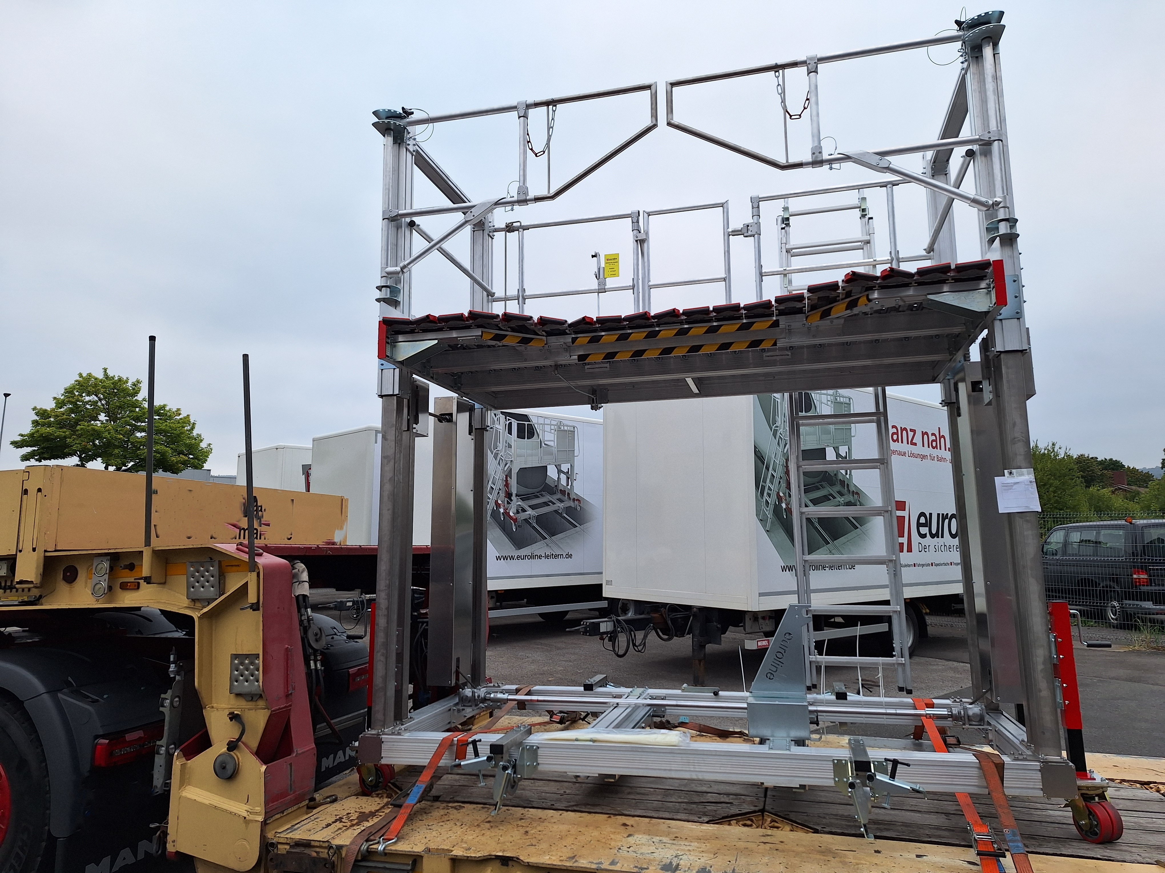 In diesem Fall jedoch wurde die komplette Konstruktion einer mobilen Arbeitsbühne bereits bei uns im Werk montiert und als fertige Einheit ausgeliefert. Damit geht sie für den Kunden sofort einsatzbereit auf die Reise.