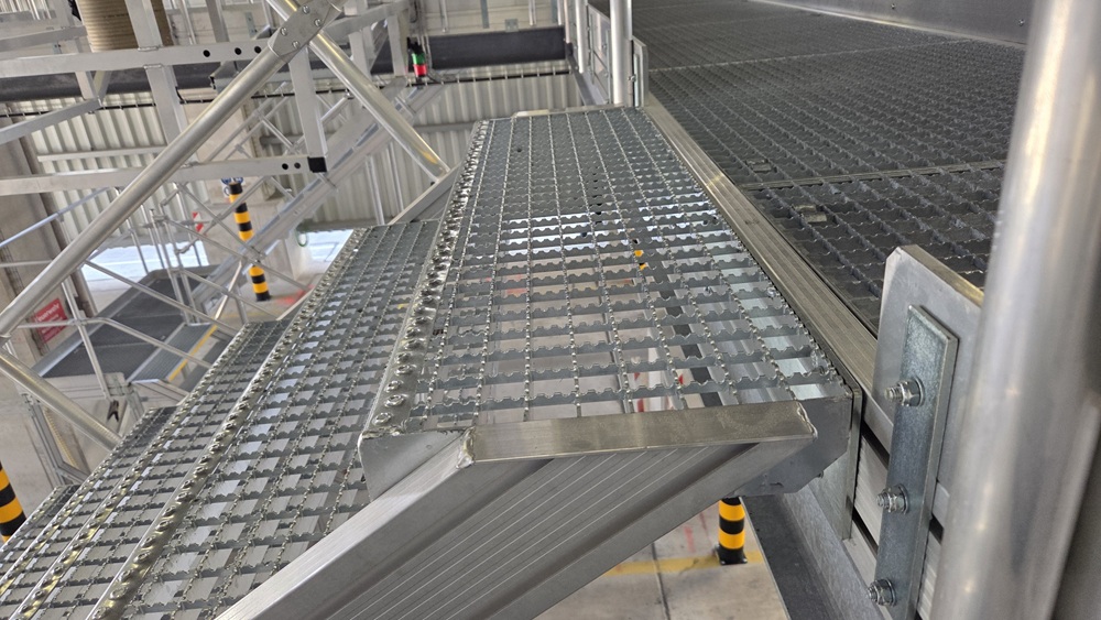 Die Haupttragstruktur besteht aus einer Aluminiumkonstruktion, die gezielt wegen ihres günstigen Verhältnisses aus Gewicht, Korrosionsbeständigkeit und Tragfähigkeit ausgewählt wurde. Die Laufflächen wurden mit Stahlgitterrosten ausgeführt, um Rutschfestigkeit, Drainagefähigkeit und Langlebigkeit sicherzustellen. Ergänzend wurden verzinkte Stahlkonsolen eingesetzt, die die Verbindung zur Bestandsstruktur herstellen und gleichzeitig eine dauerhafte Korrosionsbeständigkeit gewährleisten.