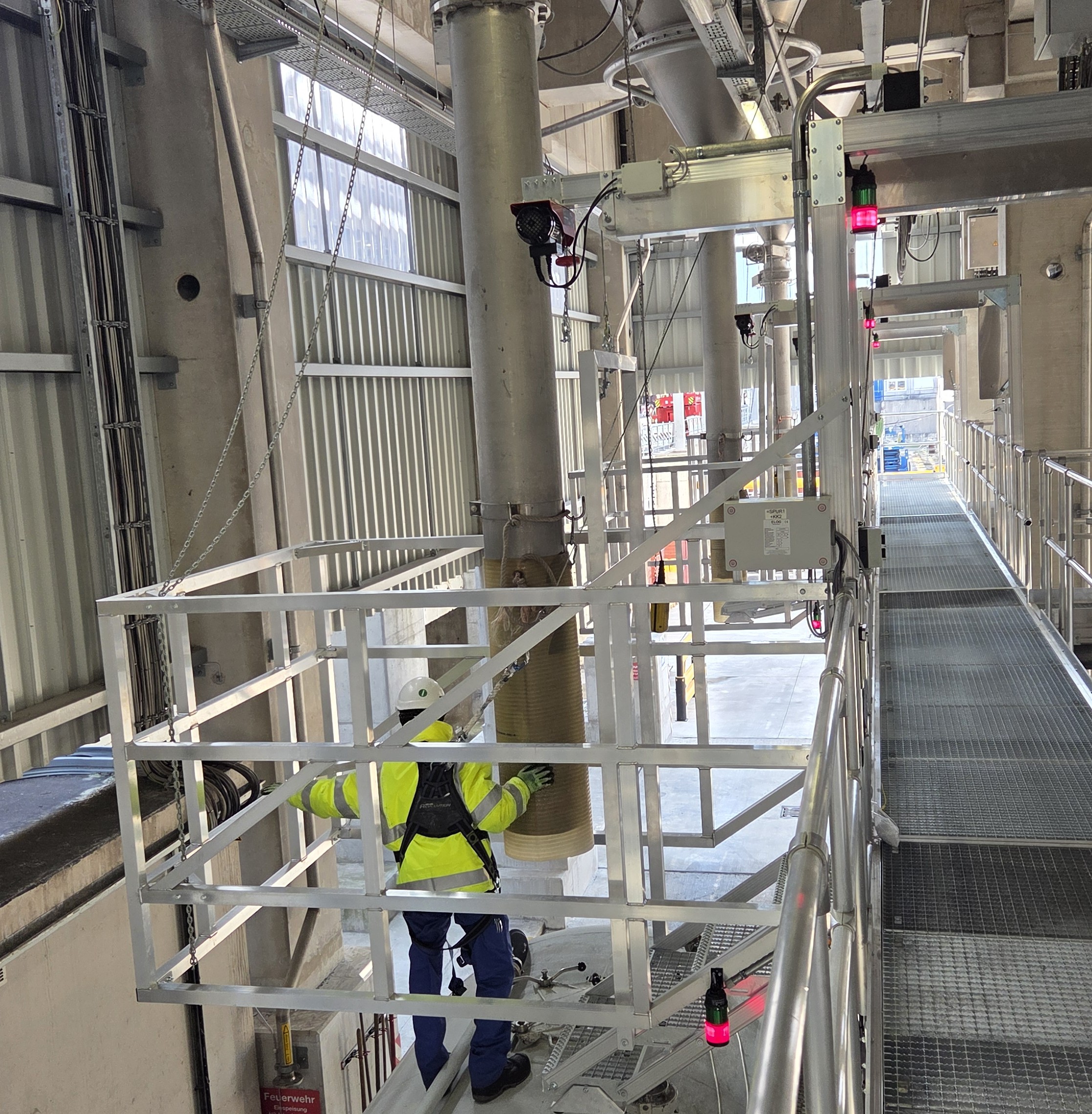 Der Zugang zur Arbeitsbühne erfolgt über fest installierte Treppenanlagen. Die gesamte Arbeitsbühne ist mit einem umlaufenden Geländersystem ausgestattet, dass den aktuellen sicherheitstechnischen Anforderungen entspricht und einen vollständigen Absturzschutz gewährleistet.