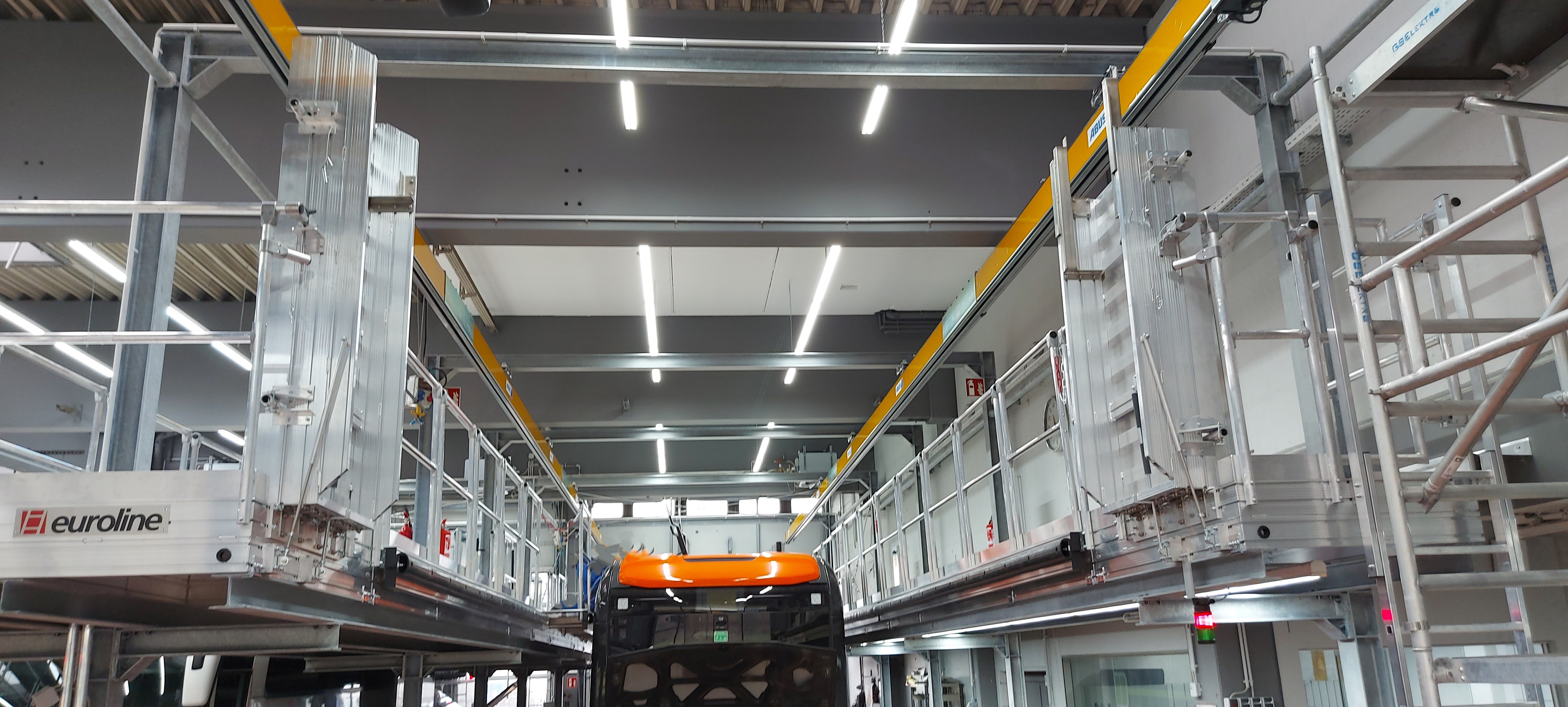 Für das Projekt wurden zwei stationäre Arbeitsbühnen der Marke euroline geliefert und installiert. Die Bühnen sind speziell für die Wartung von Elektro- und Wasserstoffbussen konzipiert und bieten maximale Flexibilität, Stabilität und Sicherheit.